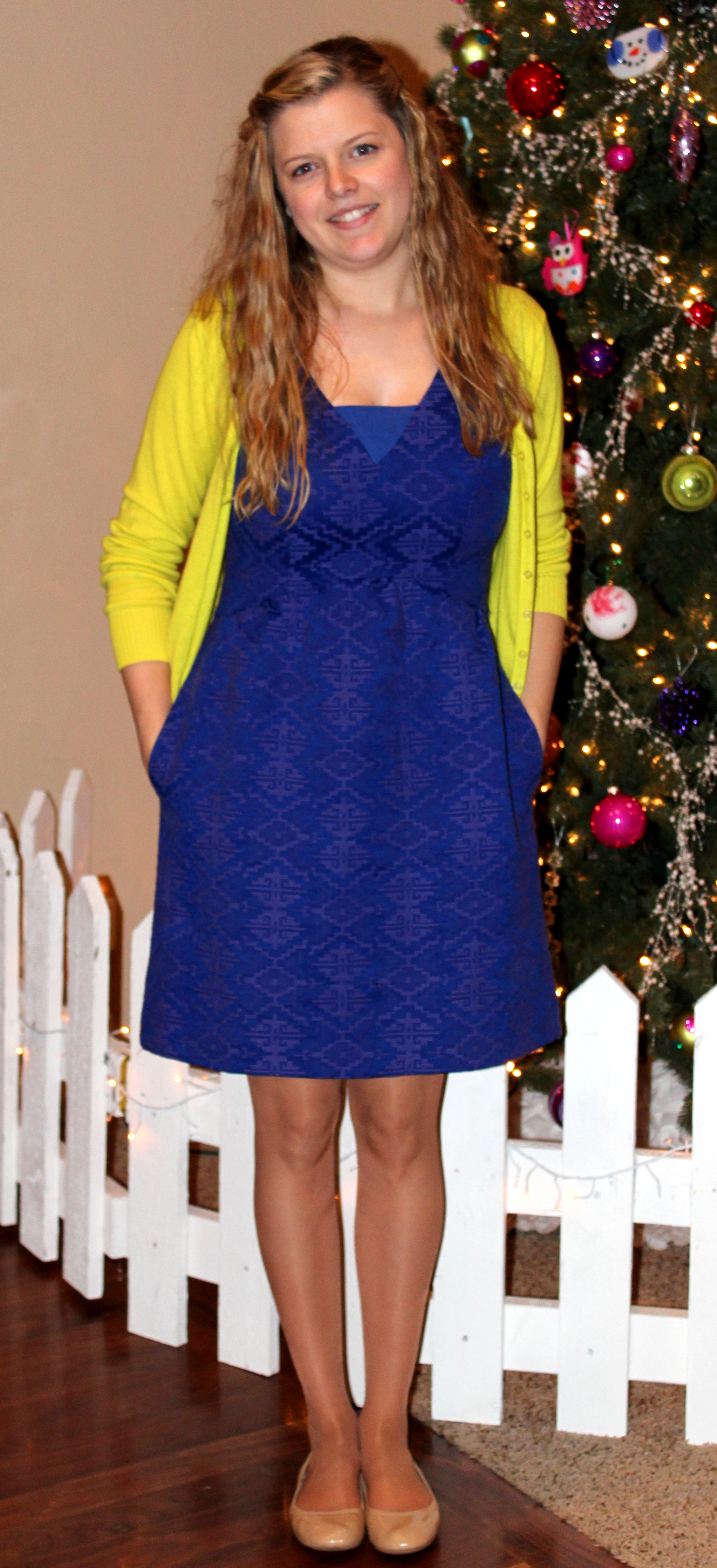 Got this cute cobalt dress on Black friday sale at Anthropologie. It is so cute and the pockets are a must! I paired it with a yellowish greenish cardigan and my favorite Cole Haan flats!!!