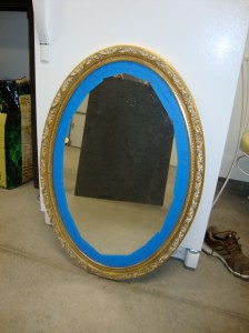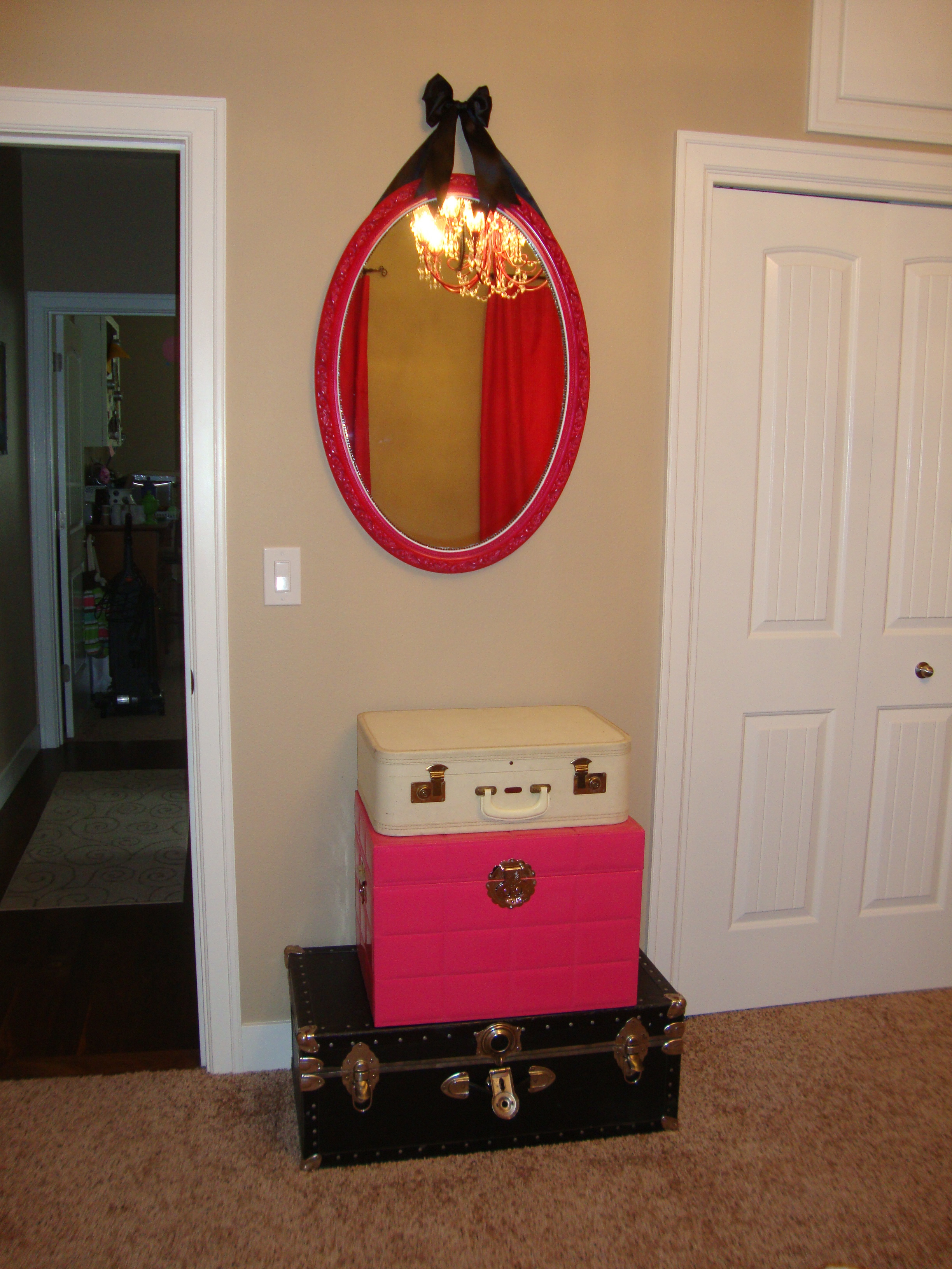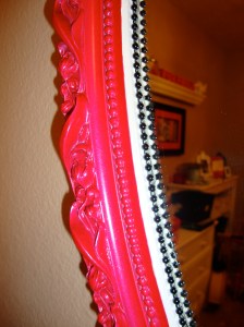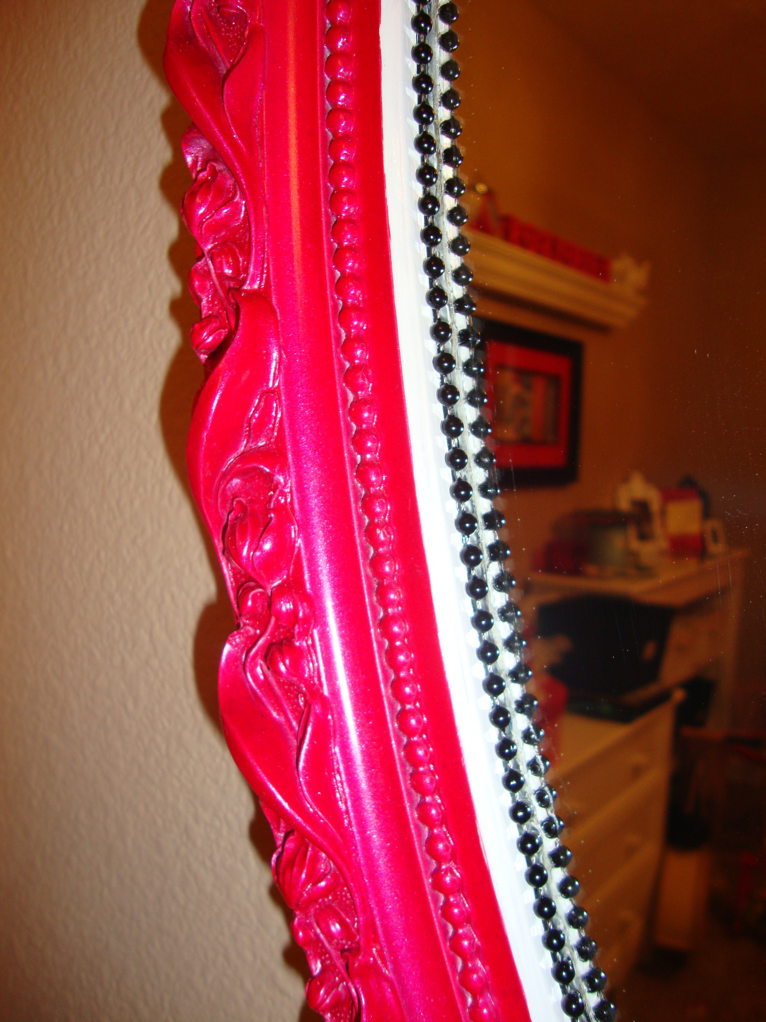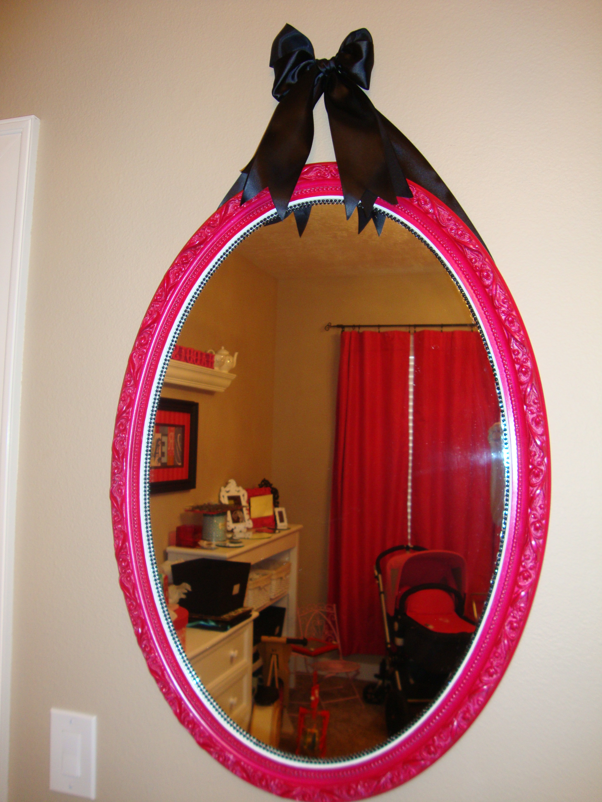 So I got this mirror at a garage sale for $5.00 a few years ago, I know it is beautiful gold, but I knew it had so much more potential. So here is the before and after, now it is hot pink with accents of white and black topped with a bow.