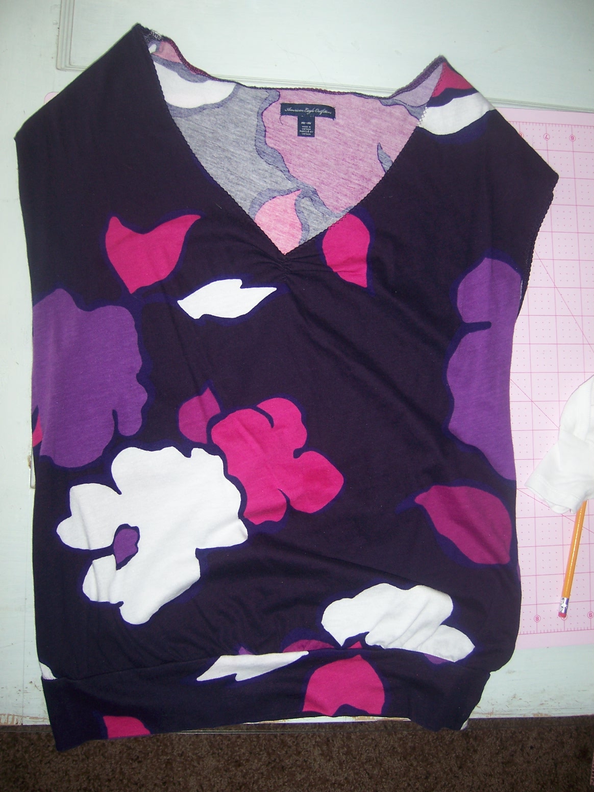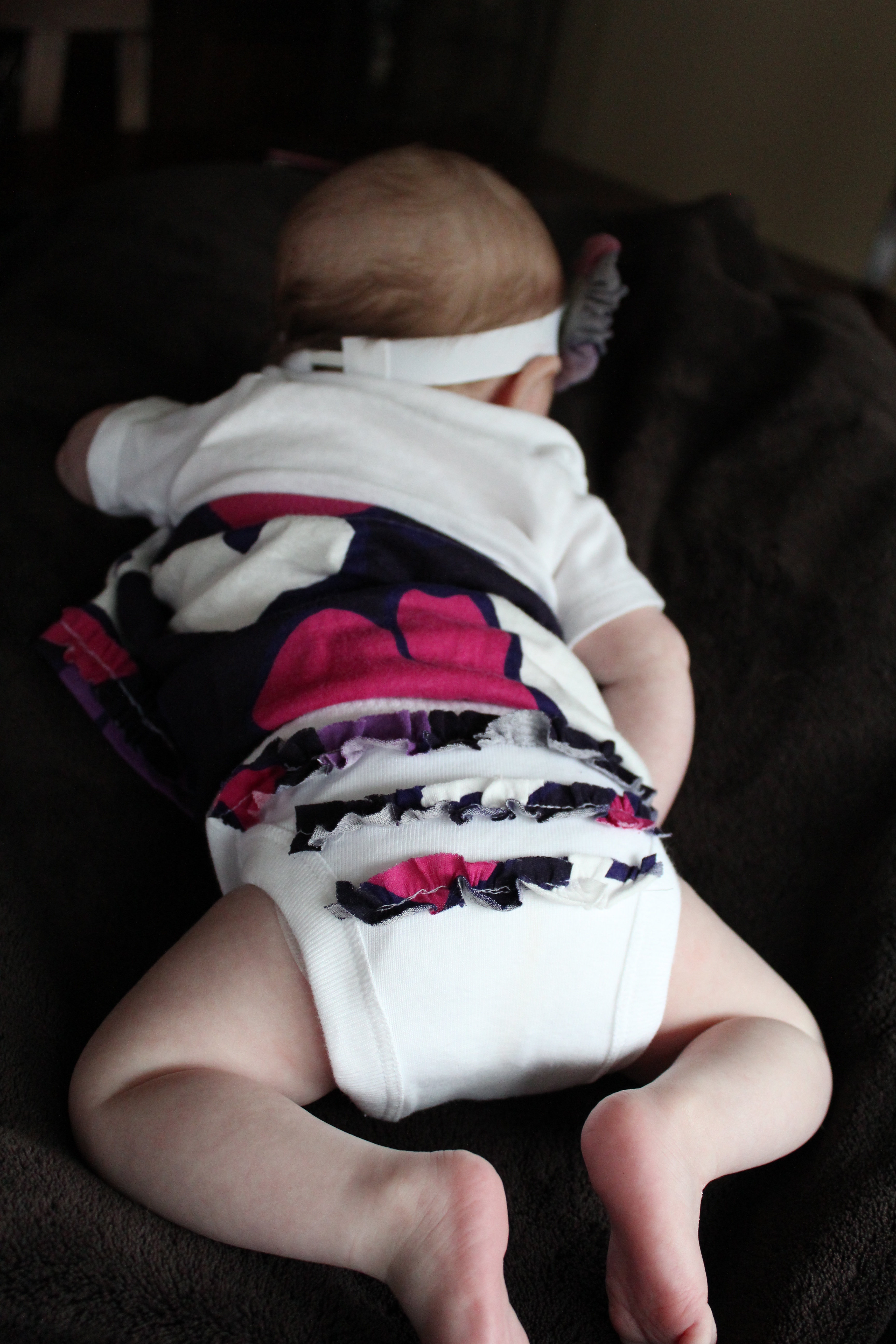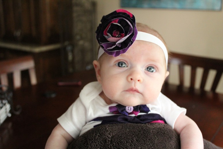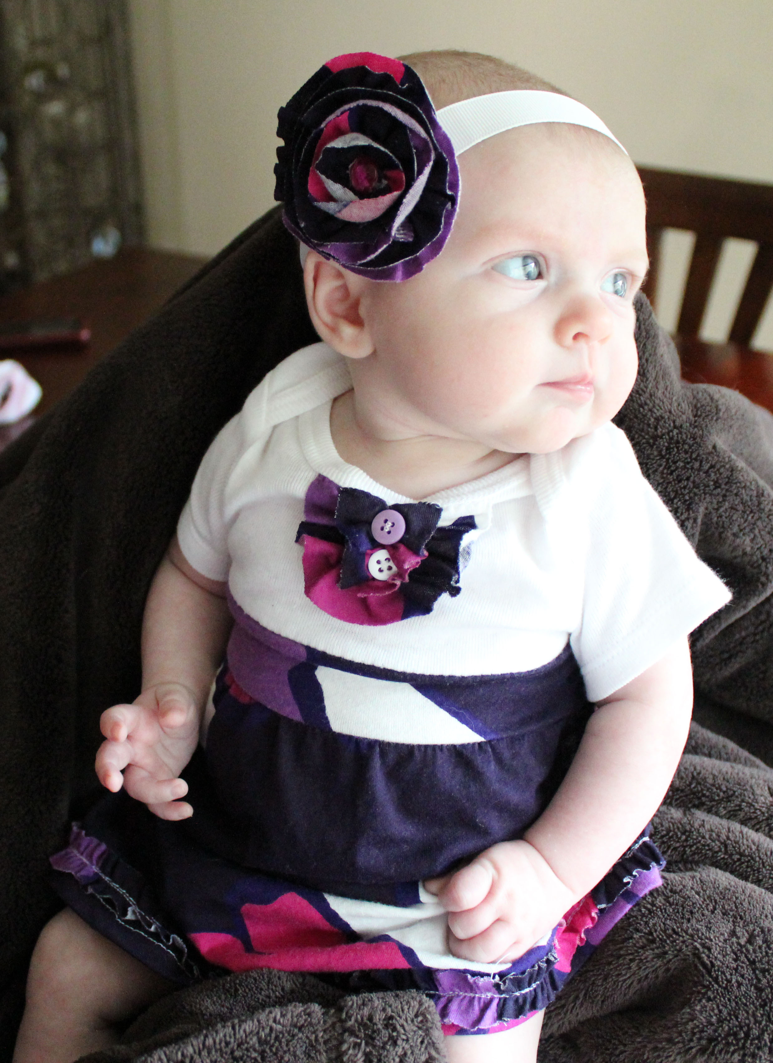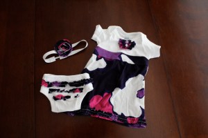Ok so I havent been able to blog for a while due to the fact that I cannot put Haddie down or quit looking at her long enough to type or create anything, in fact I am typing with her in my lap with one hand.  Not so easy.  Well here is a little dress I made for her out of an old American Eagle t-shirt of mine and a onzie.  Love it and cannot wait to go through my closet for more shirts to use.  Out of the scraps I made her a diaper cover and a headband to match.  More to come.