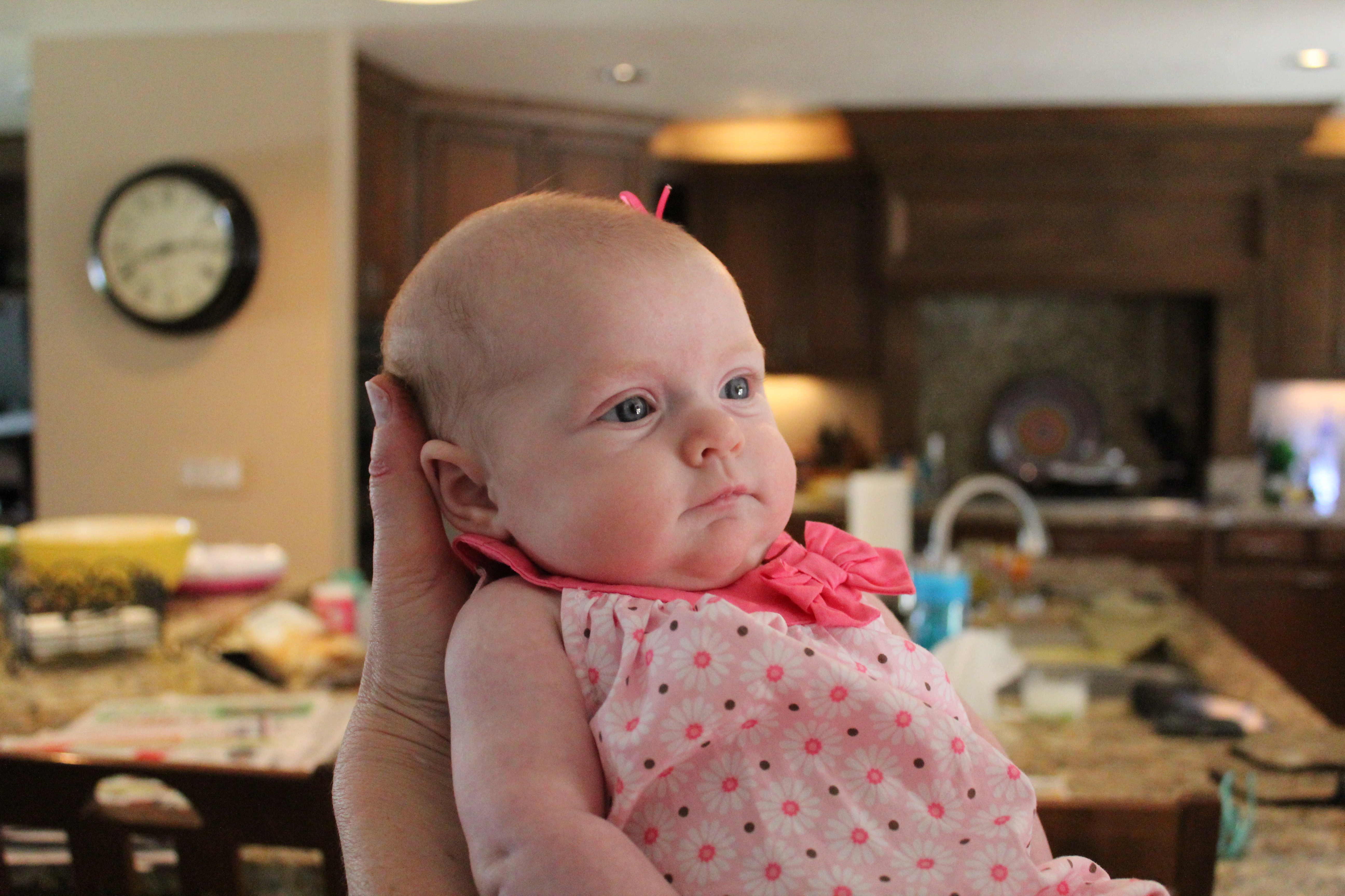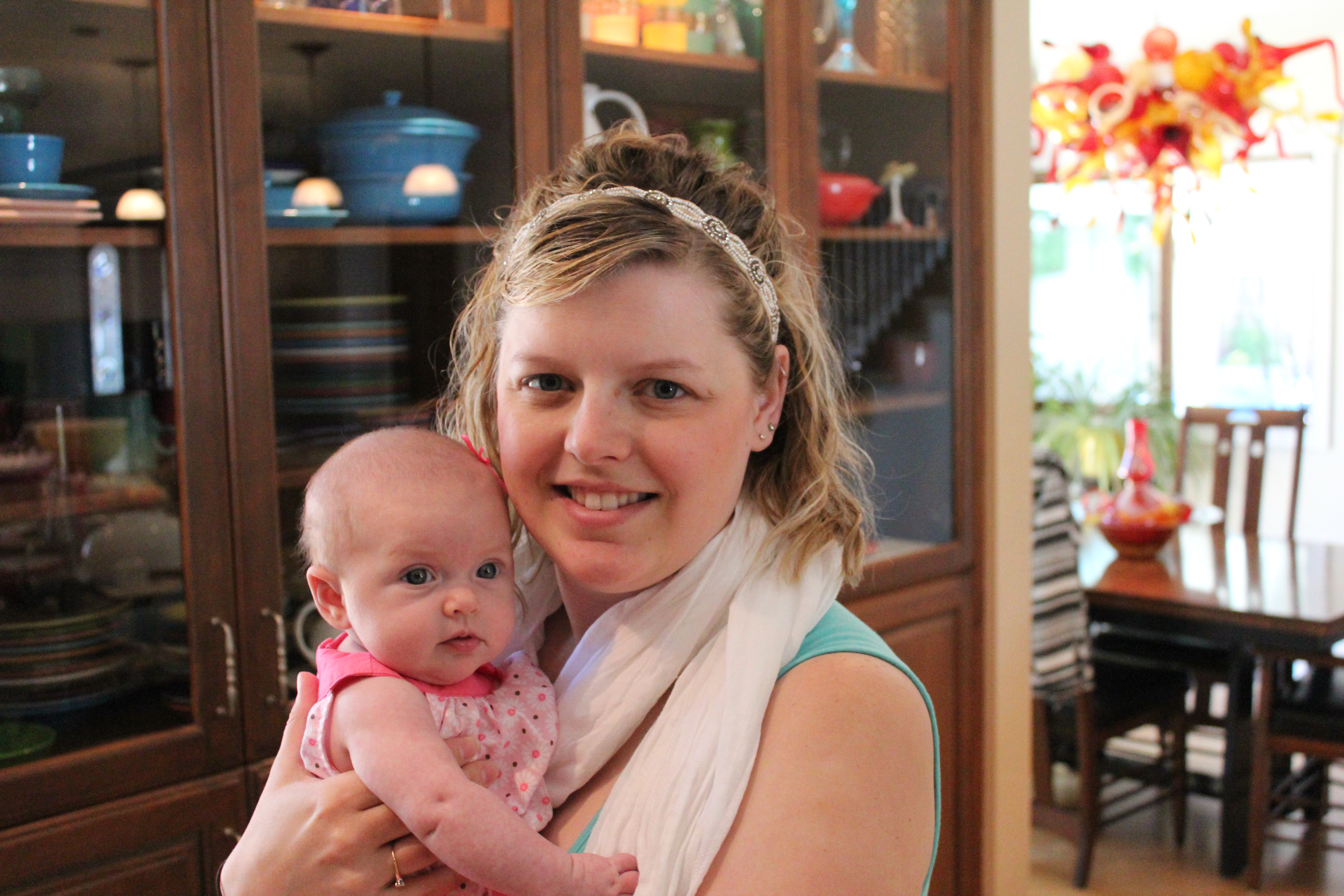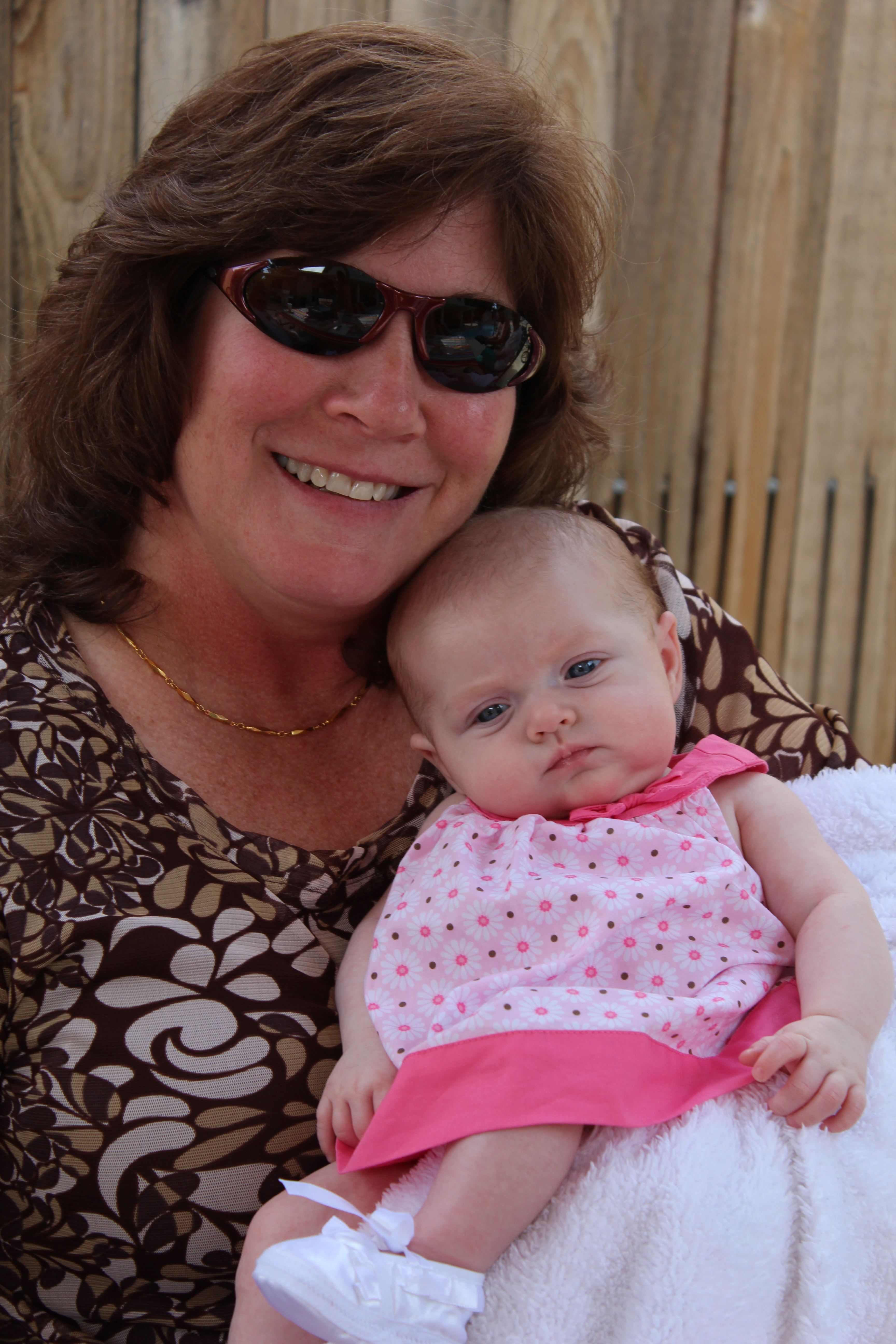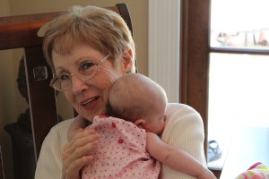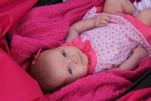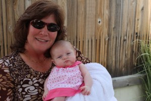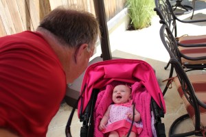 Had a BBQ at my parents house with the grandparents, and great grandparents. Earlier in the week Haddie had her first set of shots, which made her a fussy little girl, but Haddie was a much happier baby today laughing and smiling at everyone. She enjoyed talking to Grandpa Wells in her stroller and we got the cutest video of her laughing, smiling and “talking” to him for the longest time. Great Grandpa Hope came over so Haddie could say thank you for the amazingly generous gift he gave her to start her college fund…a nice letter and a check for, well lets just say it was way over the 100 dollars the adults get for their birthdays…:) She just loves to look at him and see him smiling down on her. Great Grandma Durant was over too, she was able to hold Haddie more than usual because everyone else was busy outside by the pool, I am sure she didn’t mind. Haddie was able to fall asleep in her arms just as happy as can be. It was a great day to be outside and for Haddie to start feeling better from her shots, couldn’t had timed it better myself.