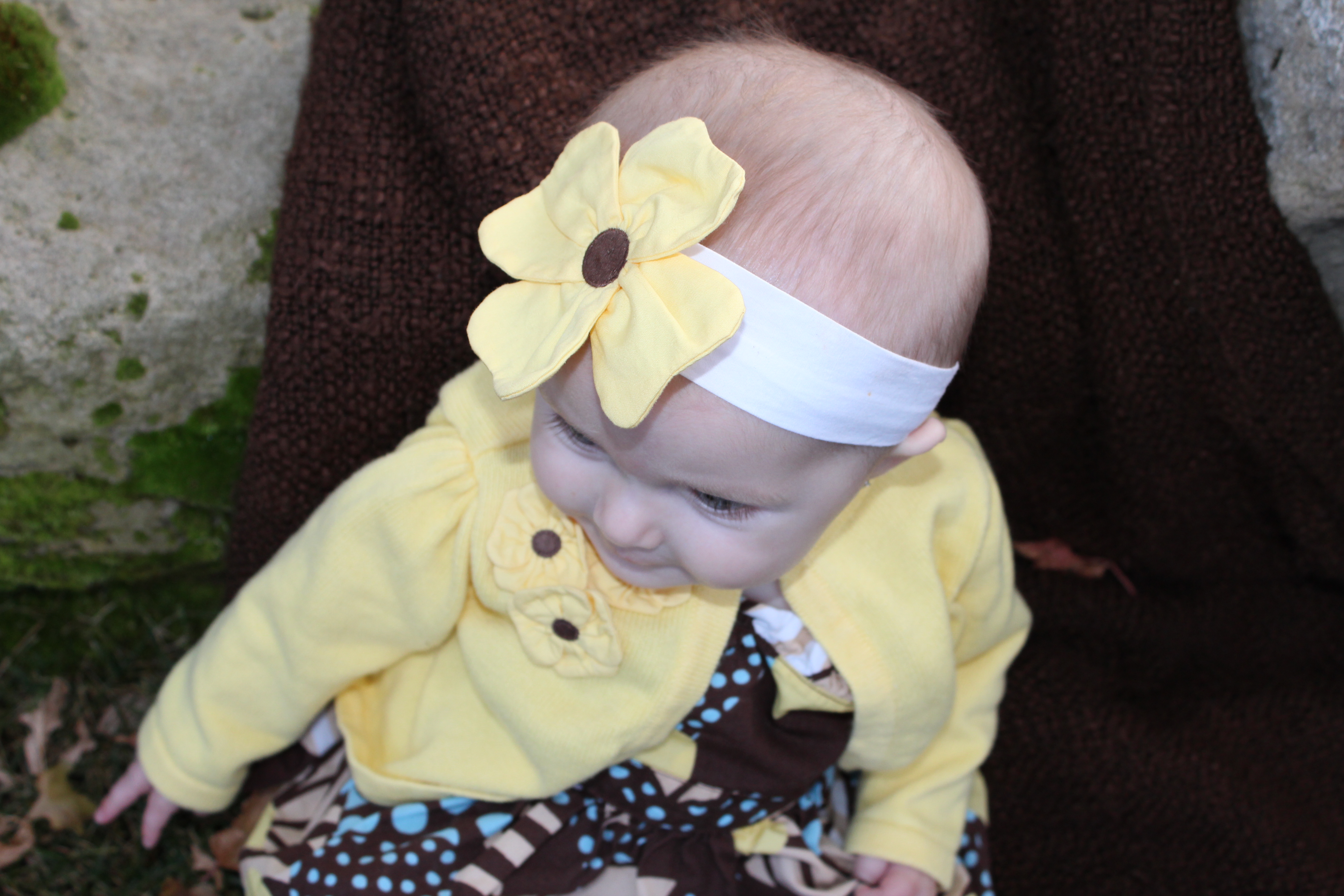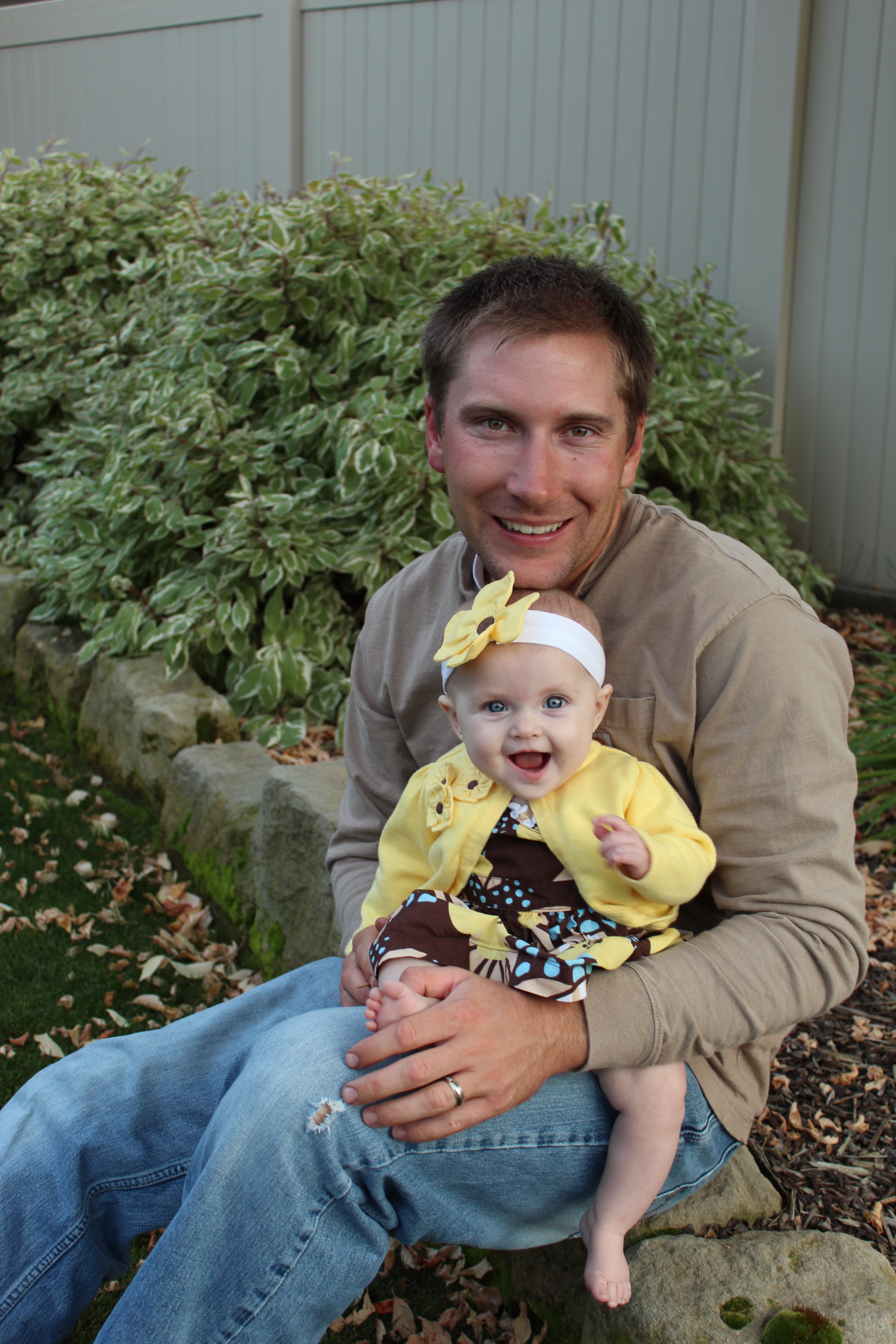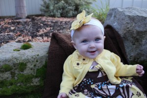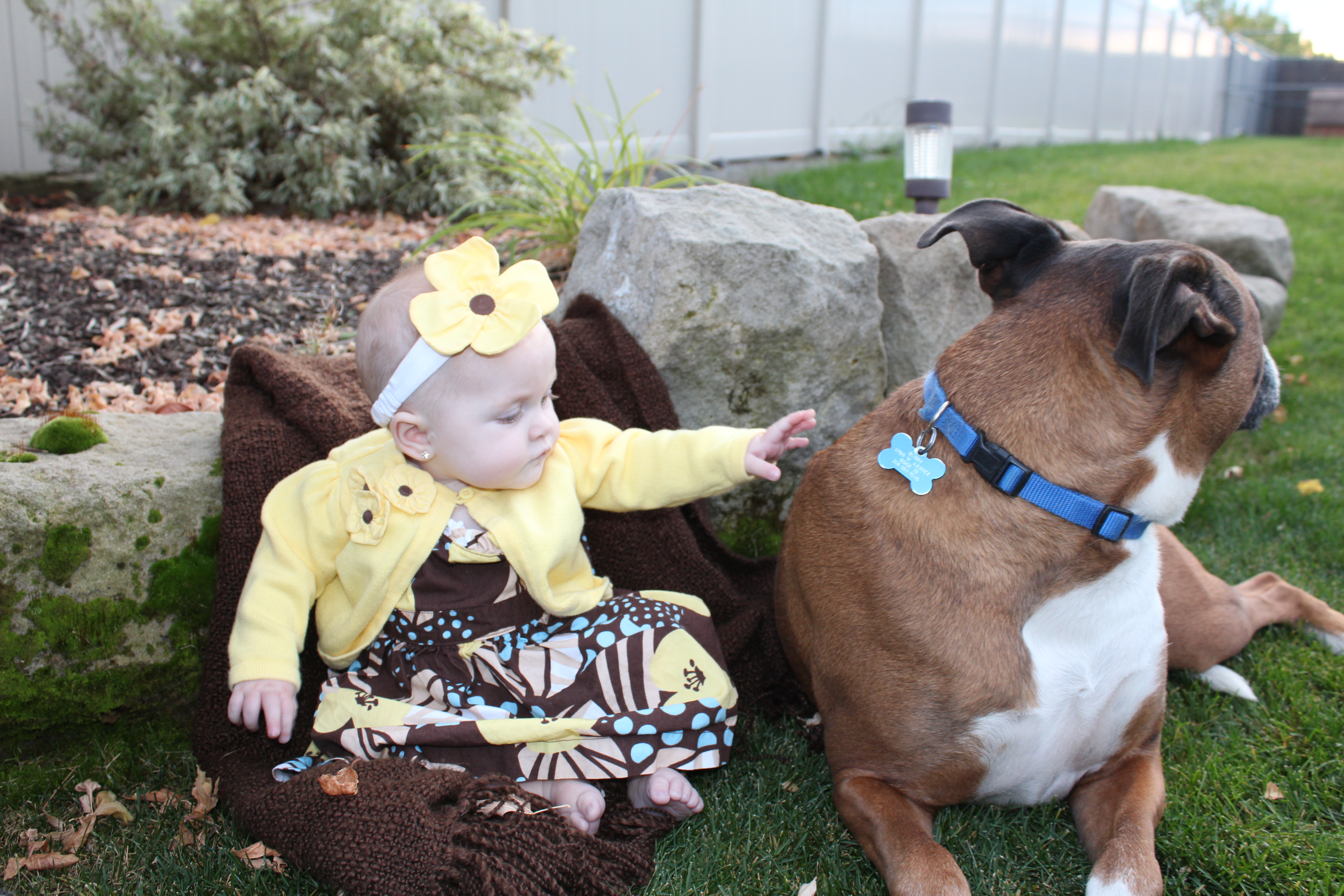 In-prompt-to pictures of Haddie in her cute fall dress and cardigan. Starting to sit up, for short periods of time, and smiling a lot more. She’s so happy!!!Haddie and Buddy. He was a little distracted by the dogs next door…