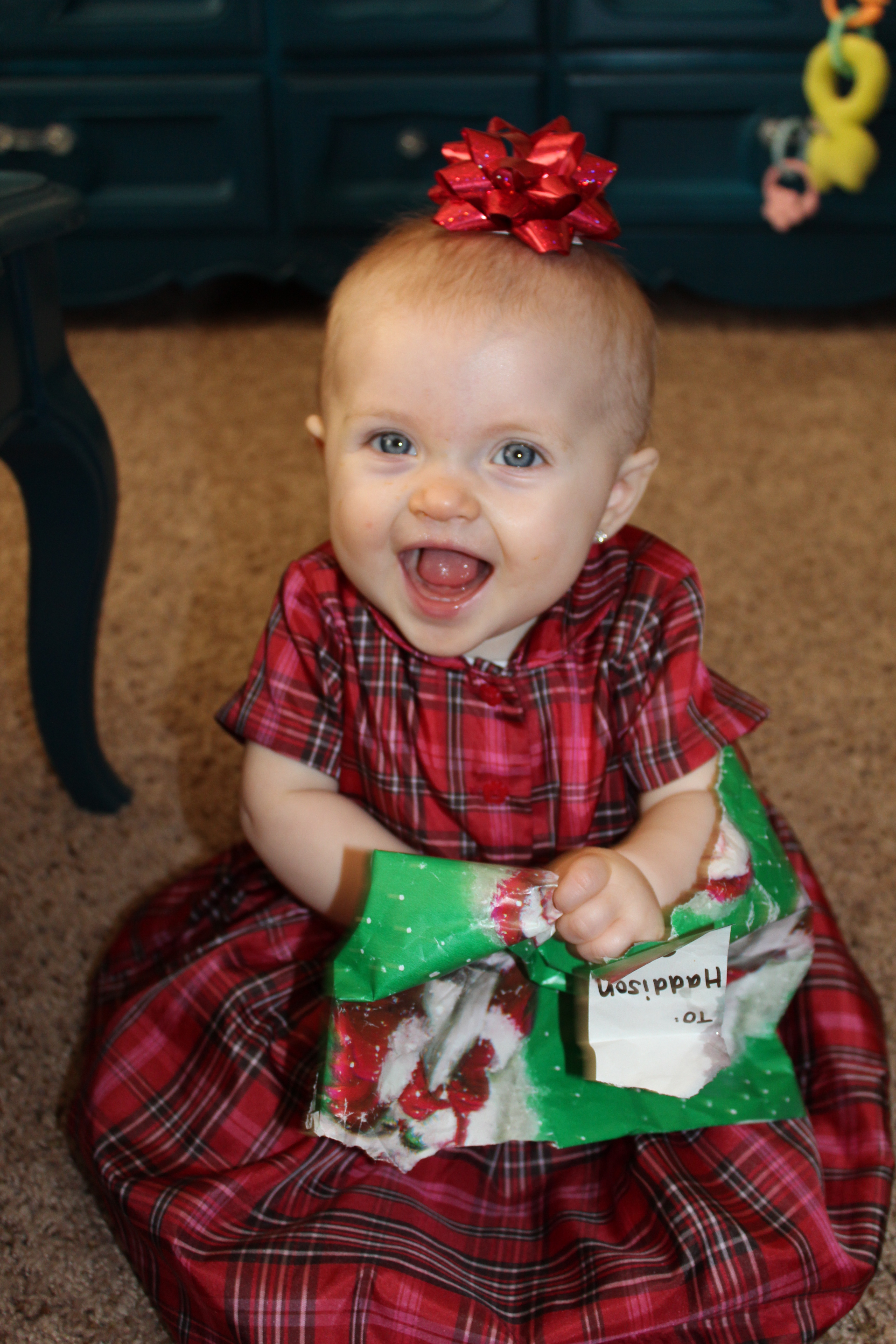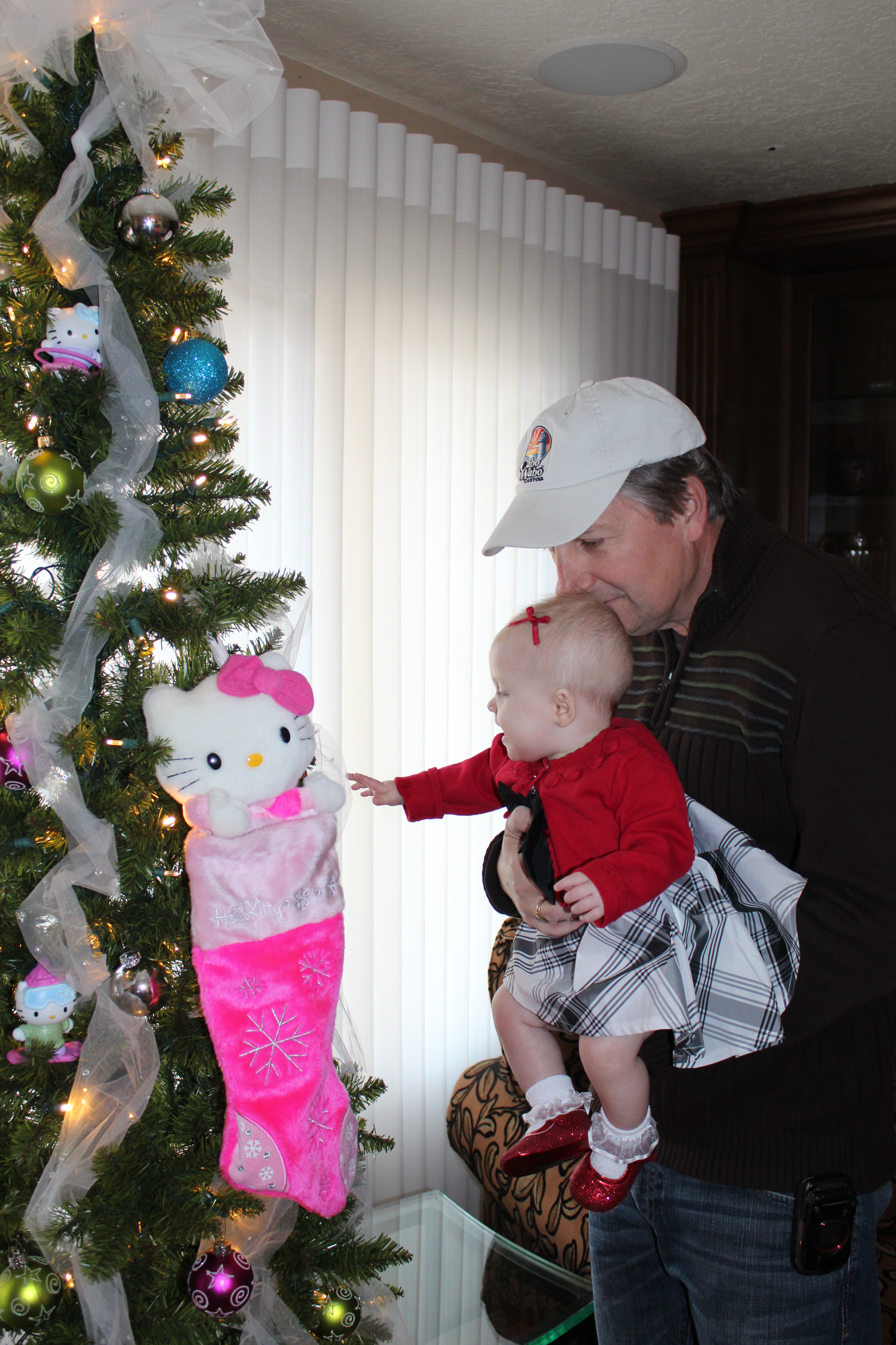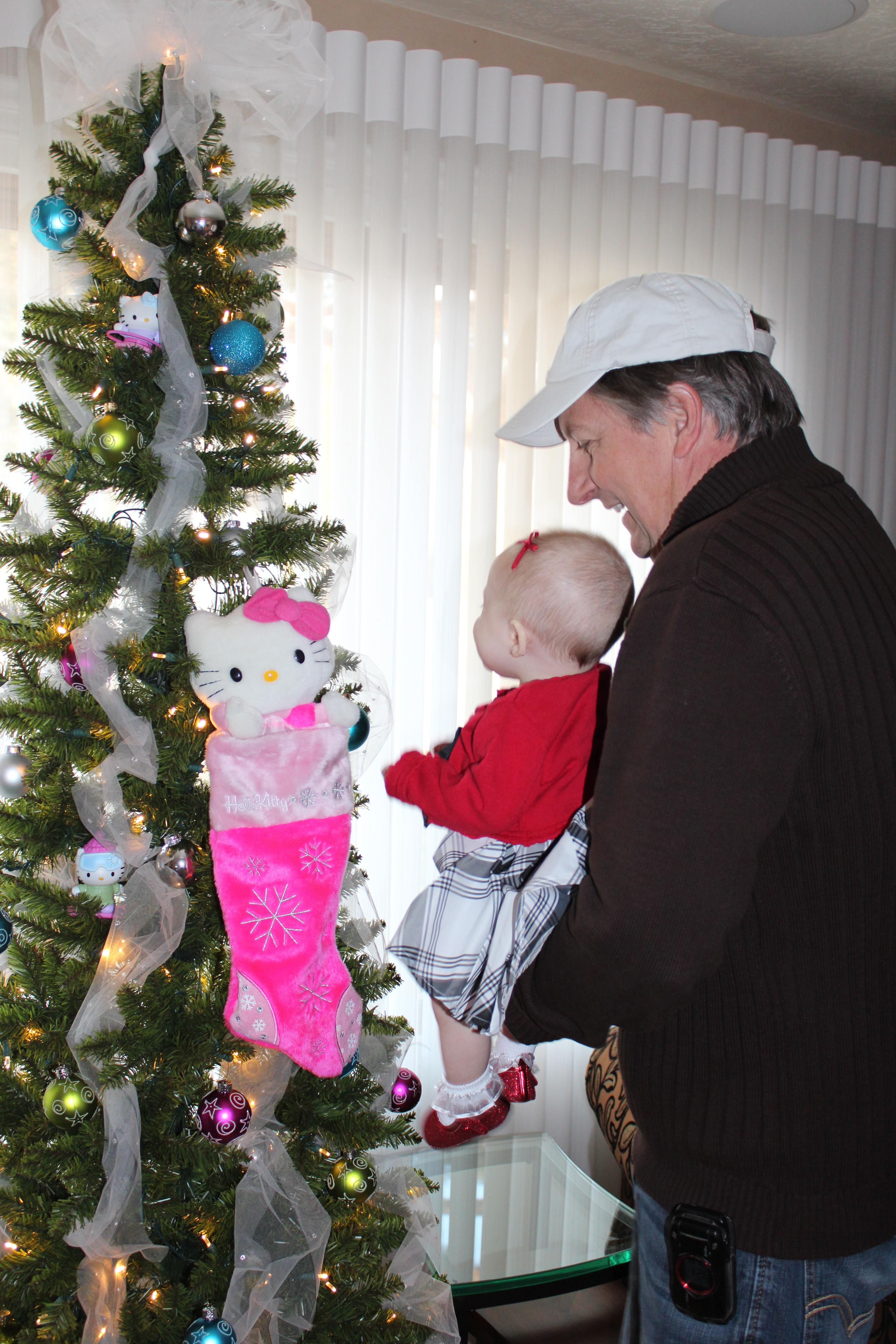 After seeing Santa we went back to Grandma and Grandpa’s house. Grandpa was showing Haddie her Hello Kitty tree Grandma put up for her. She loved looking at it and even pulled off some of the decorations. She grabbed onto the tulle and Grandma decided to make her our present for Christmas by tying the tulle on her head like a bow.