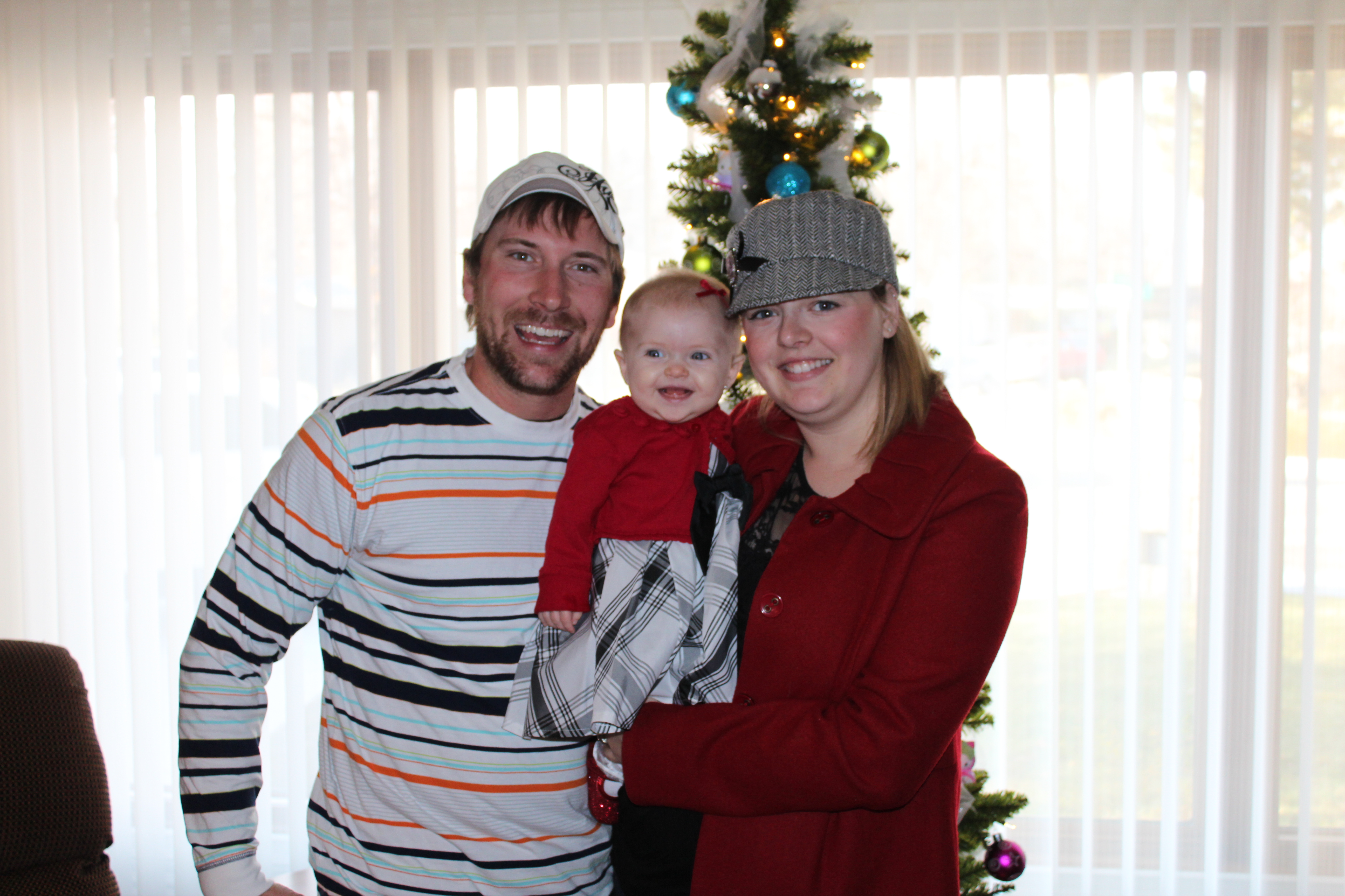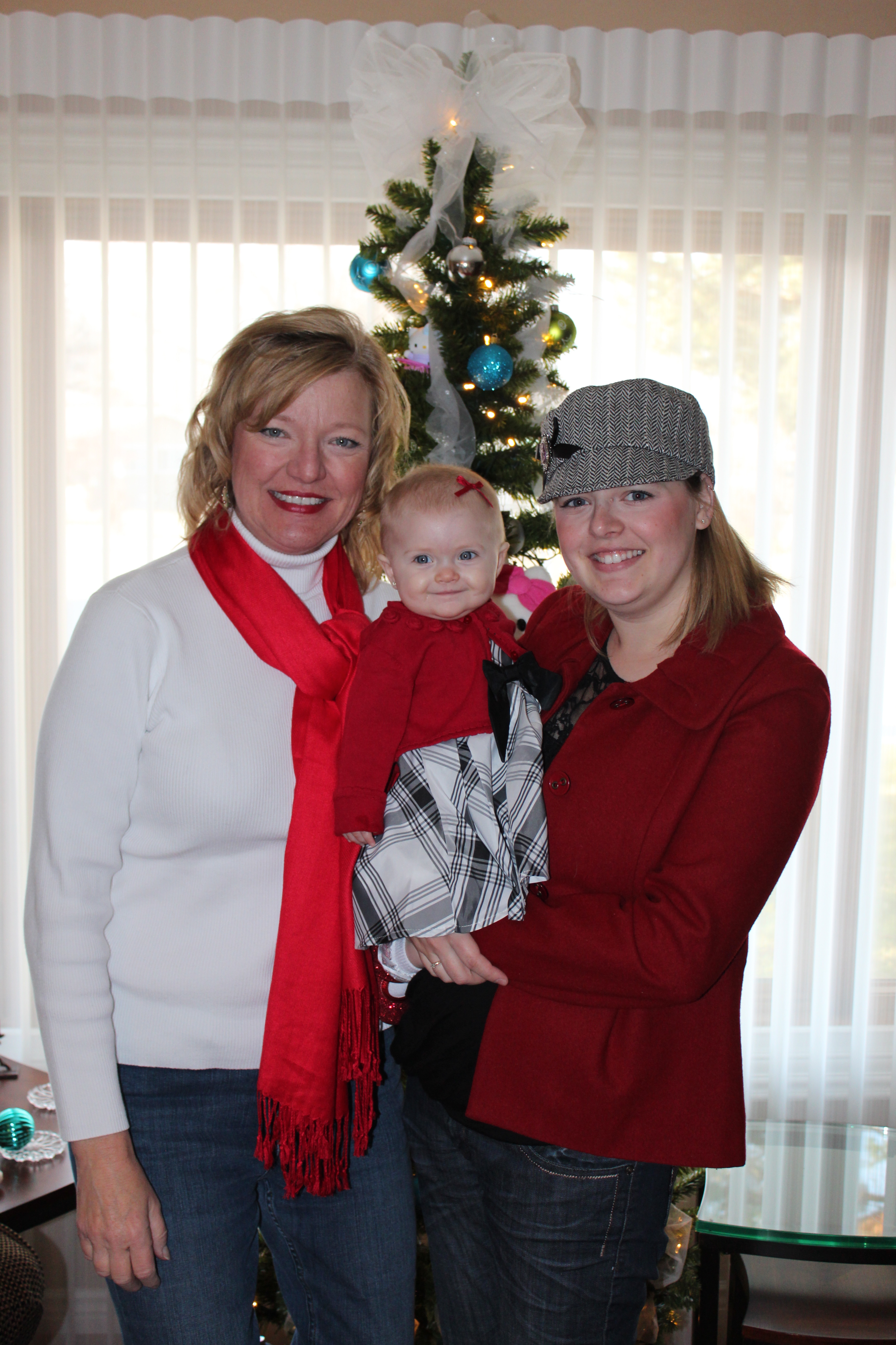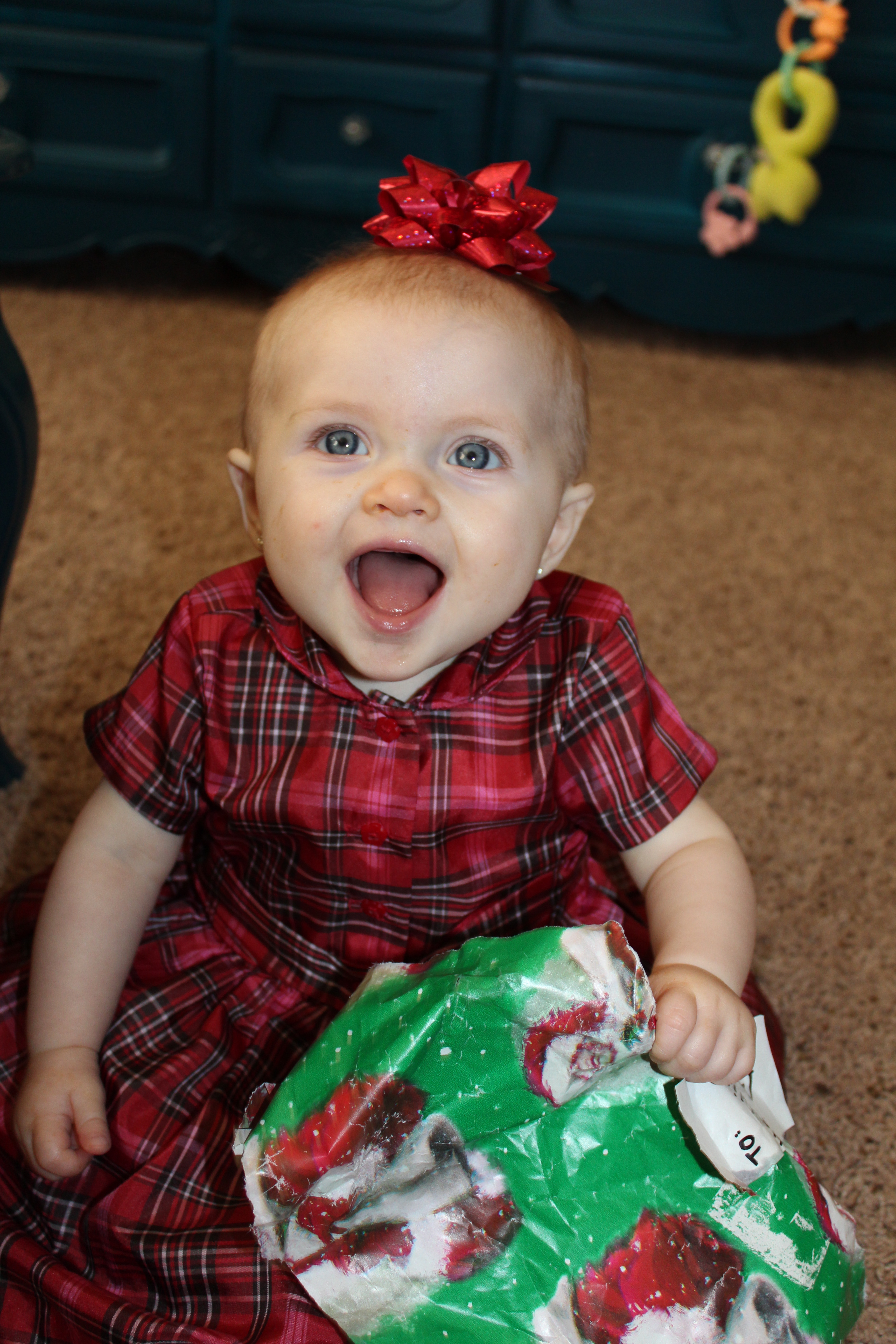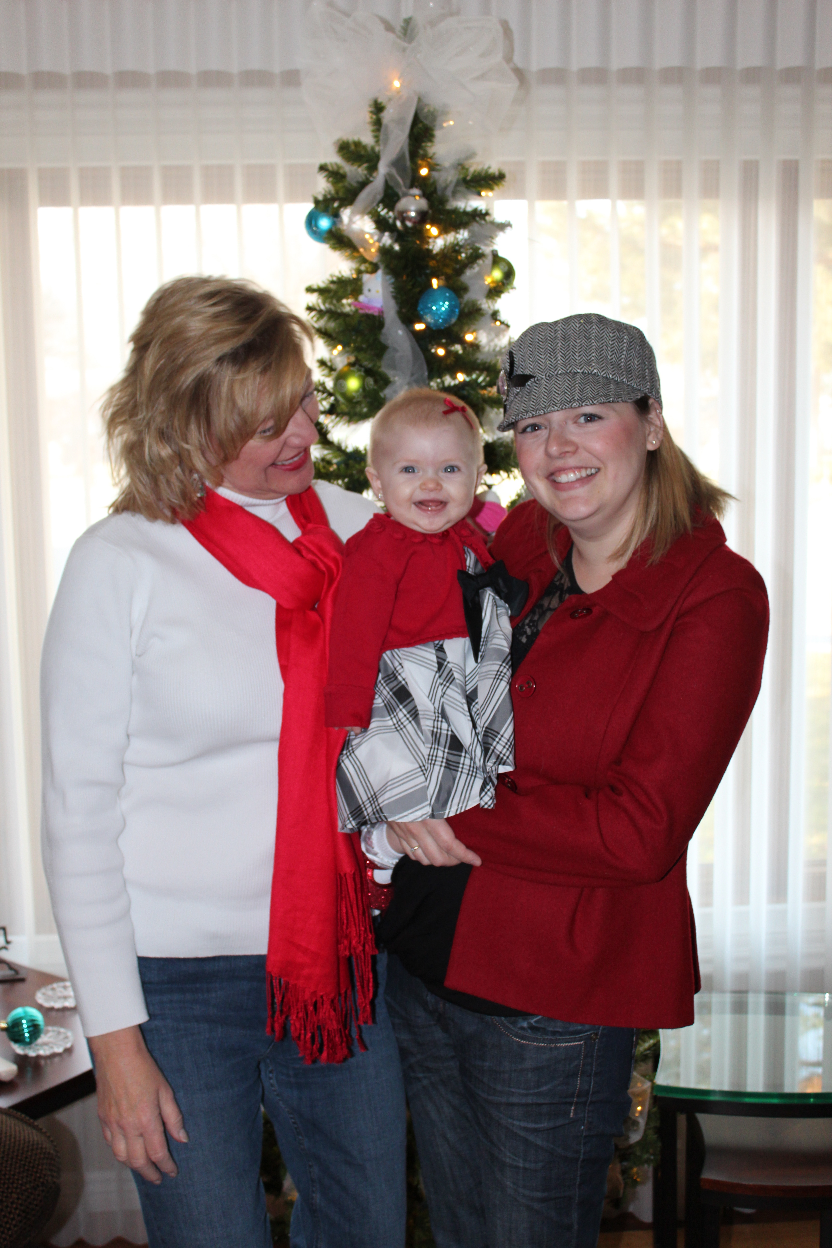 After seeing Santa we went back to Grandma and Grandpa’s house. Grandpa was showing Haddie her Hello Kitty tree Grandma put up for her. She loved looking at it and even pulled off some of the decorations. She grabbed onto the tulle and Grandma decided to make her our present for Christmas by tying the tulle on her head like a bow.