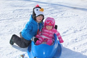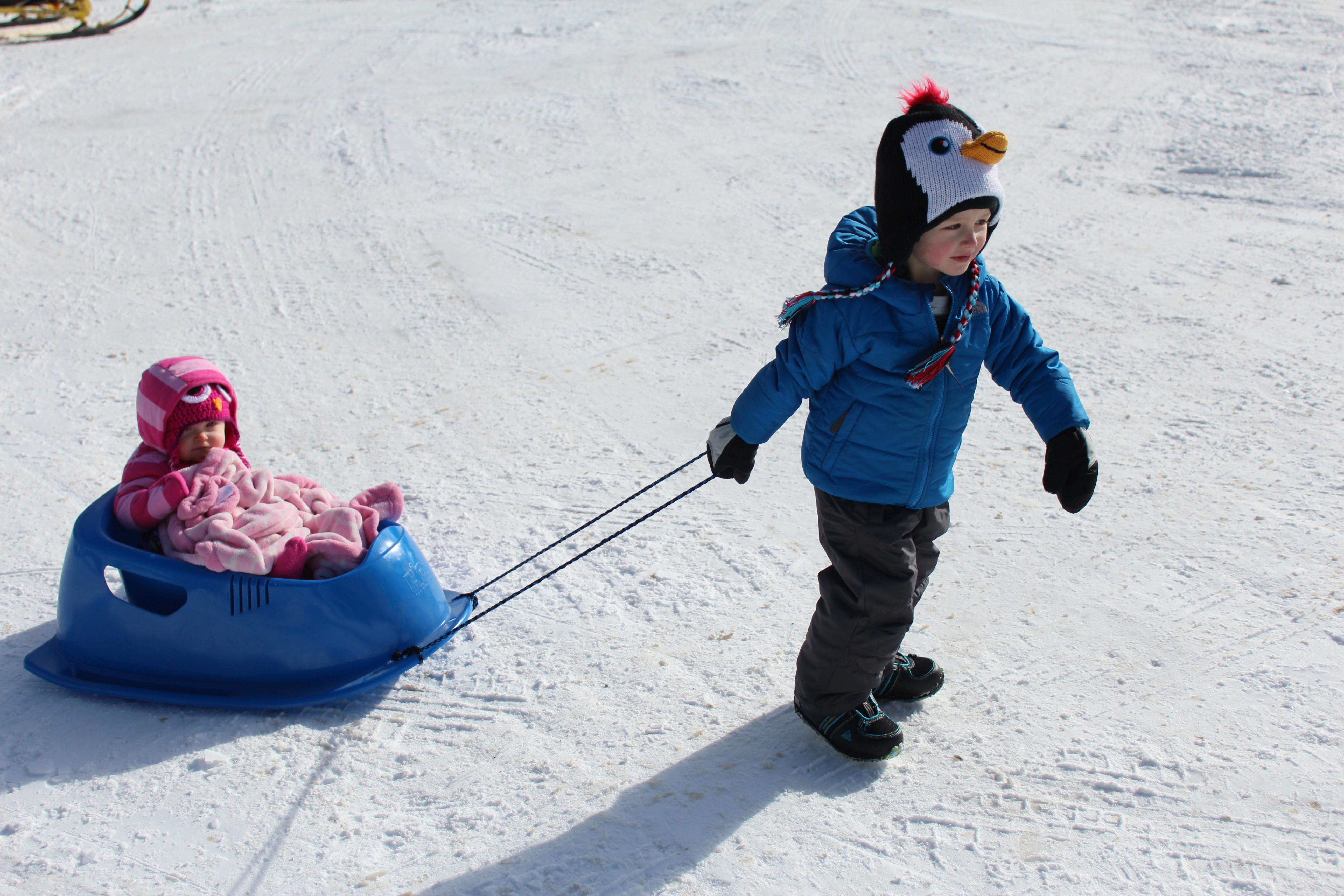 Chris built Carter a little hill to snowboard on, but he decided to sled down it instead.