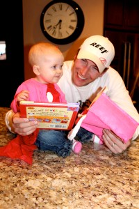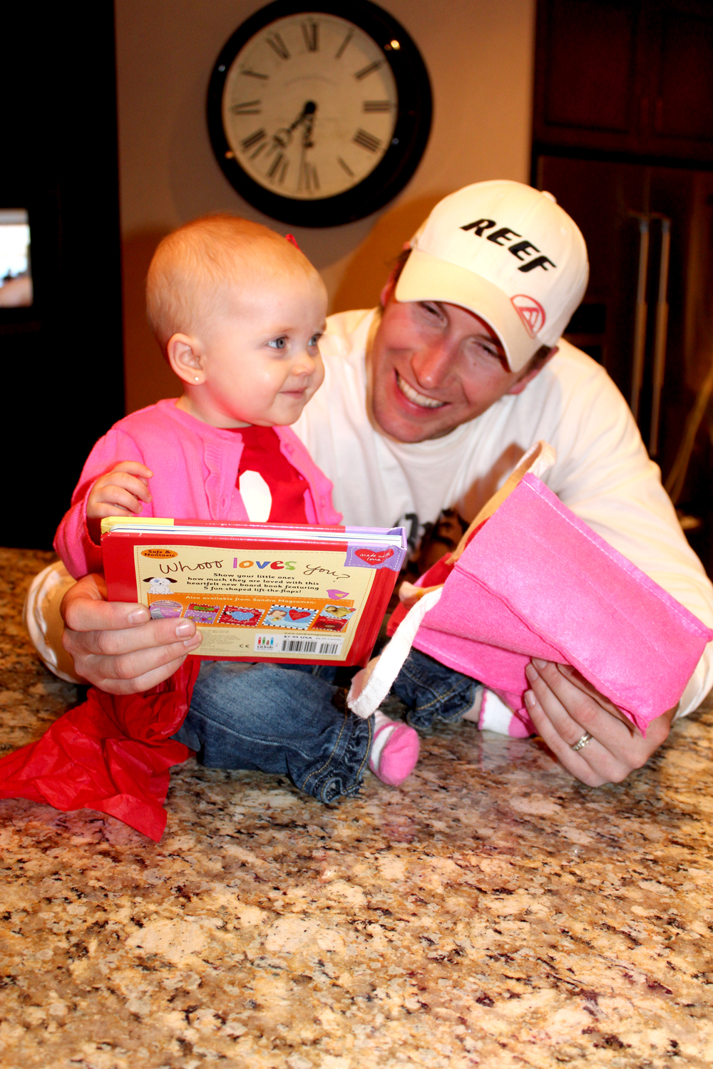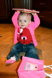 The gift bag and the book were more fun to play with than actually read. Haddie kept putting the book in and taking it out, then it ended up on her head. Crazy girl!