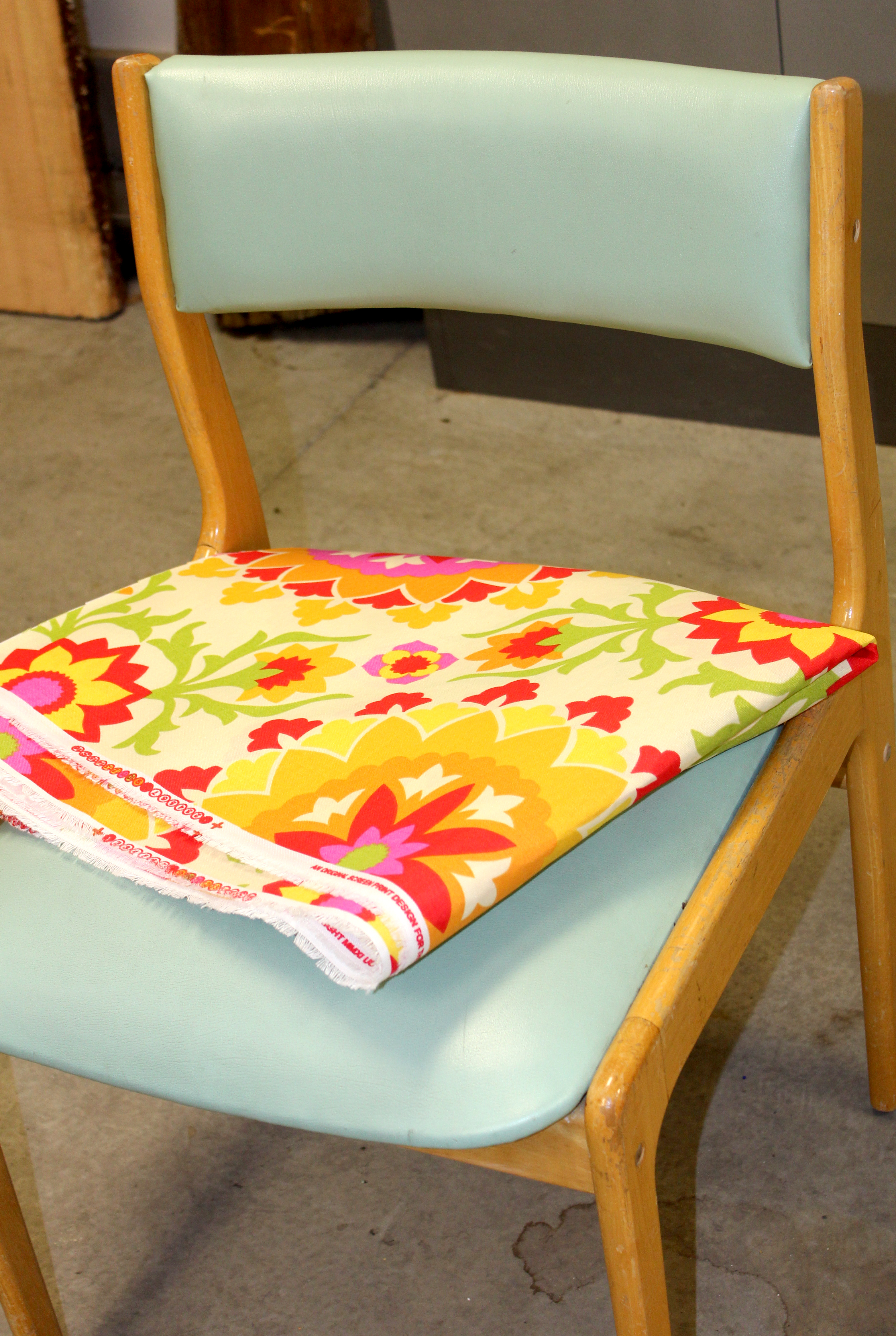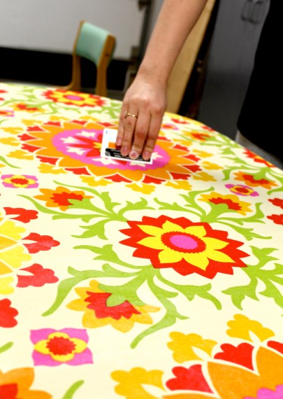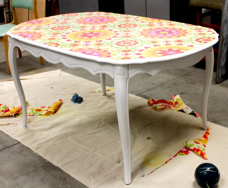Next we measured out the size of the table and trimmed the fabric to fit, with a few inches on the edges just in case.