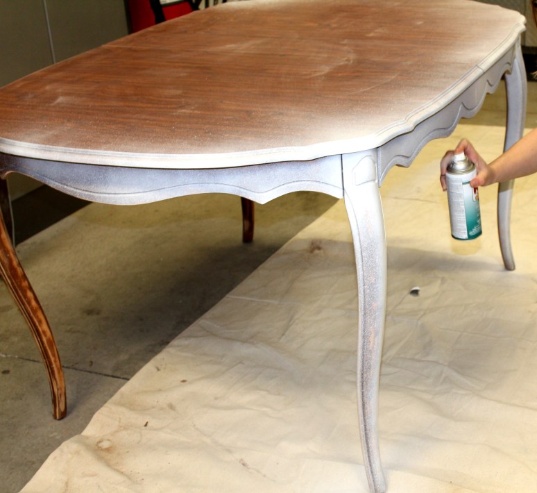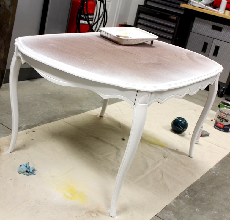 Next we sanded the piece lightly on the legs and under the top. The top was laminate so after sanding for a bit we decided that if she was to paint the top it would take a lot more sanding and even then with primer and paint it may scratch off really easily because of the slick surface…