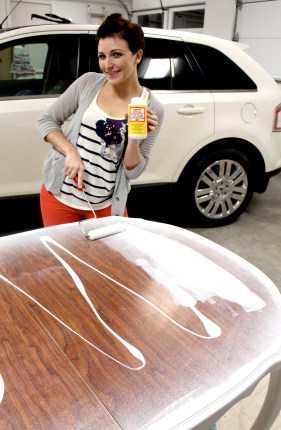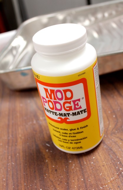 Spread the Mod Podge on the surface after sanding lightly using a dense foam roller, or brush.
