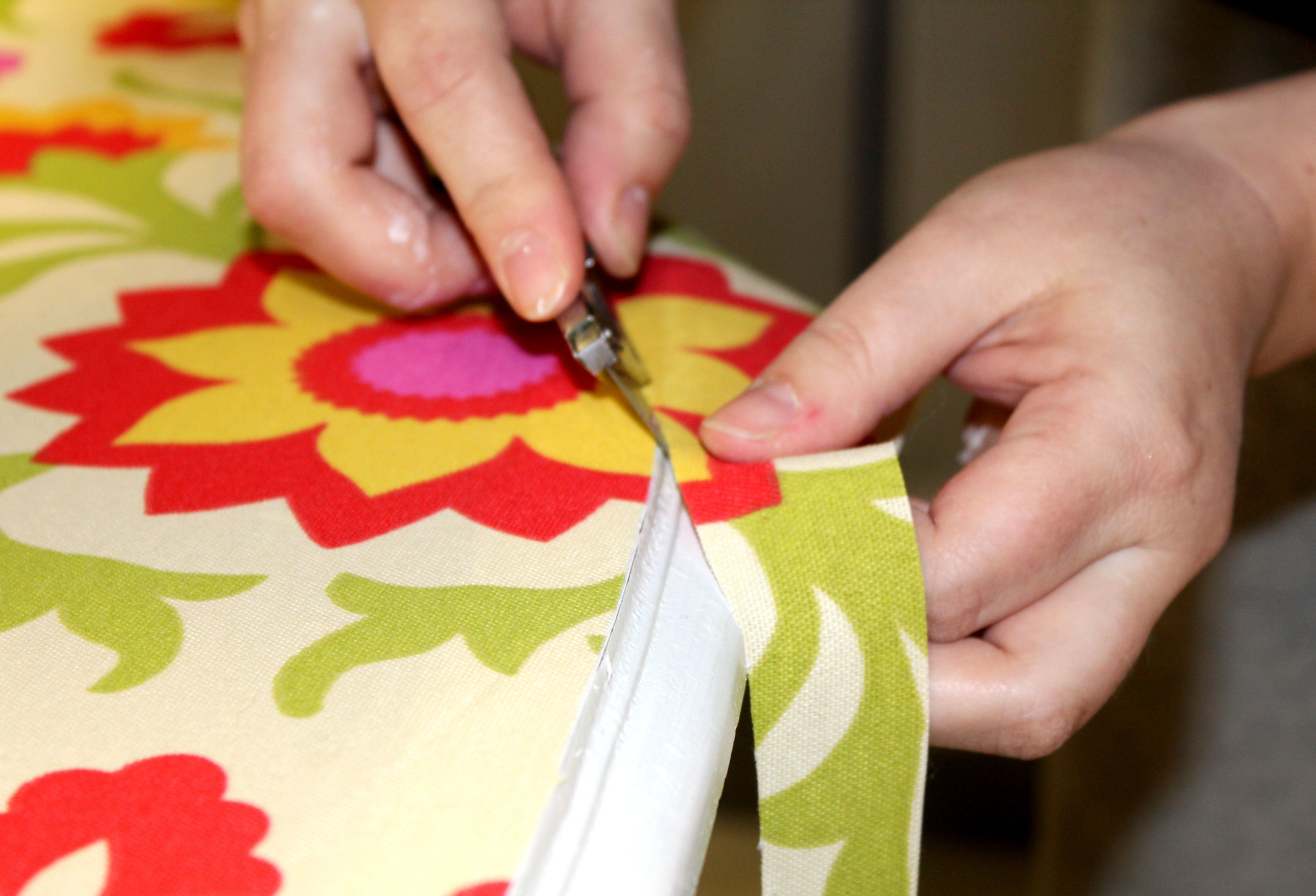 Then trim the edges with an exact-o blade or knife. We were lucky because we could use the decorative edge to “guide” our blade around the edge.
