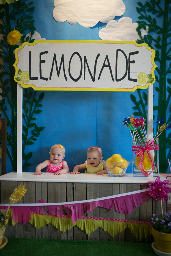 May is a crazy month for us! The girls Birthday and our Anniversary are on the same day, my Birthday, Mothers Day, and Graduation are all back-to-back for us. So needless to say our Anniversary will probably never be celebrated on the correct day, ever again… (Brett and I decided that we should just keep the day but move the month because the girls’ Birthday will come first for a while). So here is the beginning of our crazy month of May celebrating Paisley and Stella’s First Birthday with a Sunshine and Lemonade Birthday. I decided that they needed a lemonade stand so I planed it out and Brett built it for me using recycled materials we had. I will post about the building process of the stand later, but for now here is their party for you to enjoy. (Thank you Frannie with Ampersand Studios again for the photos!!!)