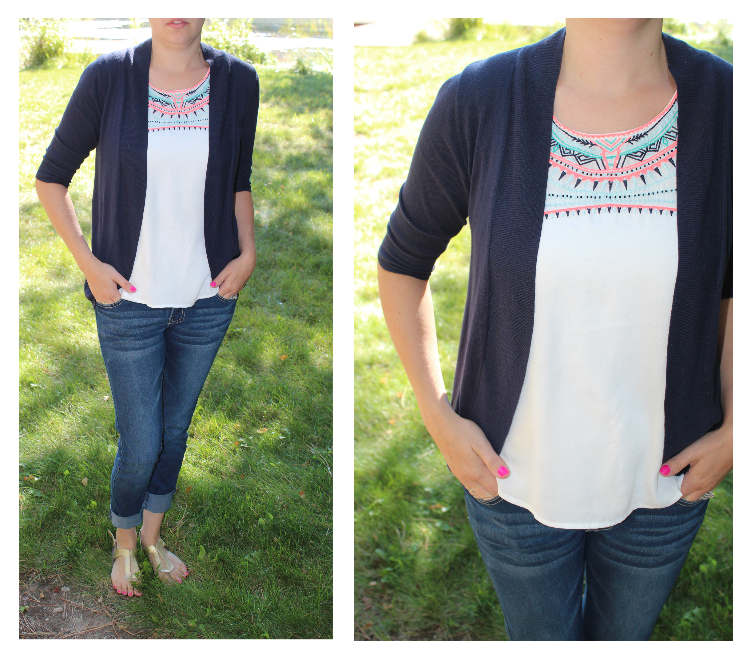 Navy Cardigan from Target sale rack, Tribal chiffon tank from Francesca’s on sale, Jeans from The Nest on Main (link here), Gold shoes from Target.