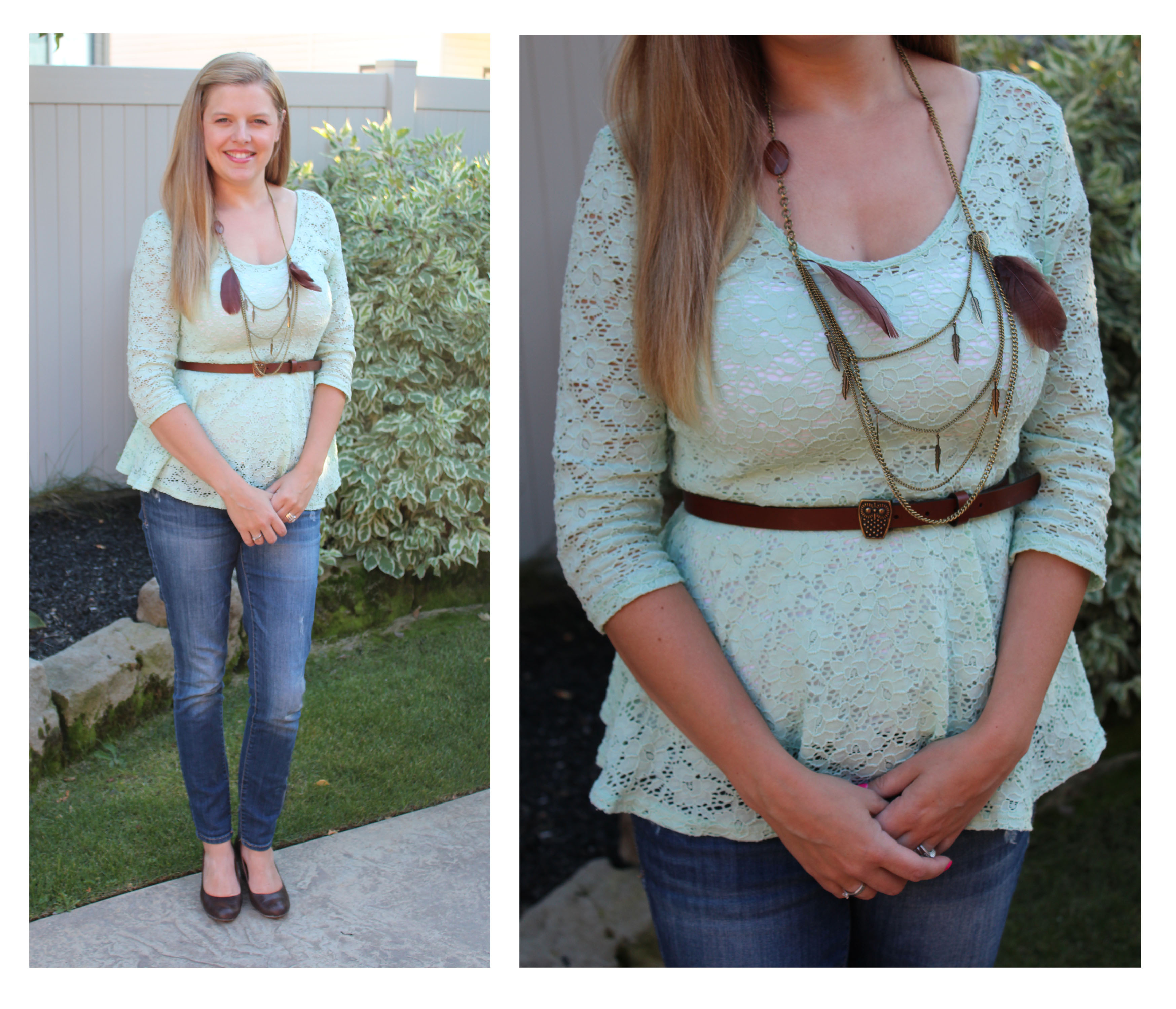 Mint lace shirt from K-mart, Jeans from Old Navy (the Rockstar style), shoes from Maurices. Nor exactly sure where I got the belt and necklace….