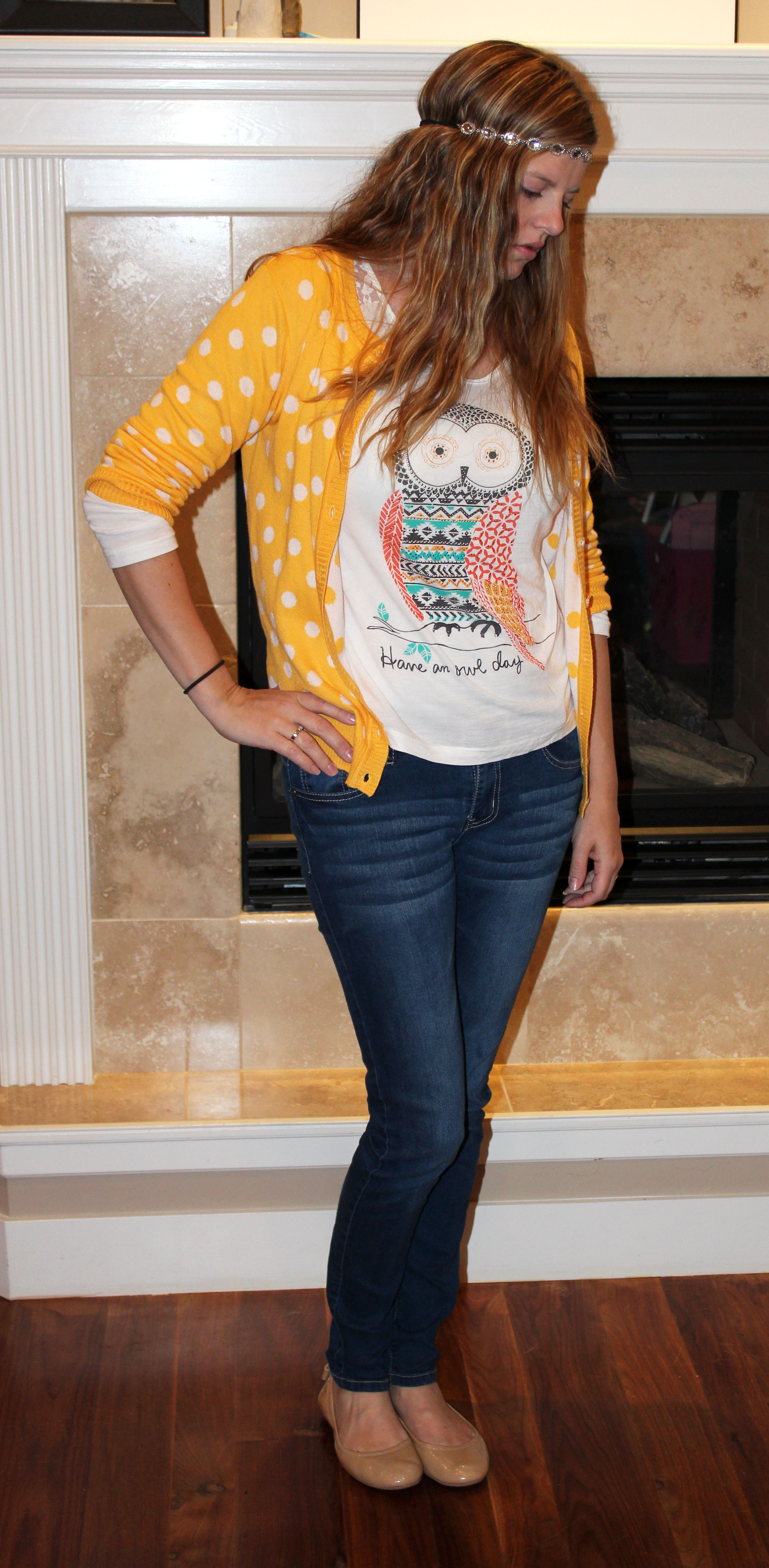 Saw this outfit on The Nest on Main and just had to have it!!!! www.thenestonmain.com, here is the owl shirt, and here is the cardigan. Love this online shop, wish I could go to Utah to see the store in person!!!! Paired the cute tops with my favorite shoes and a pair of skinny jeans. Decided to wear my hair curly and the rhinestone headband “hippy style” and actually got quite a few complements.