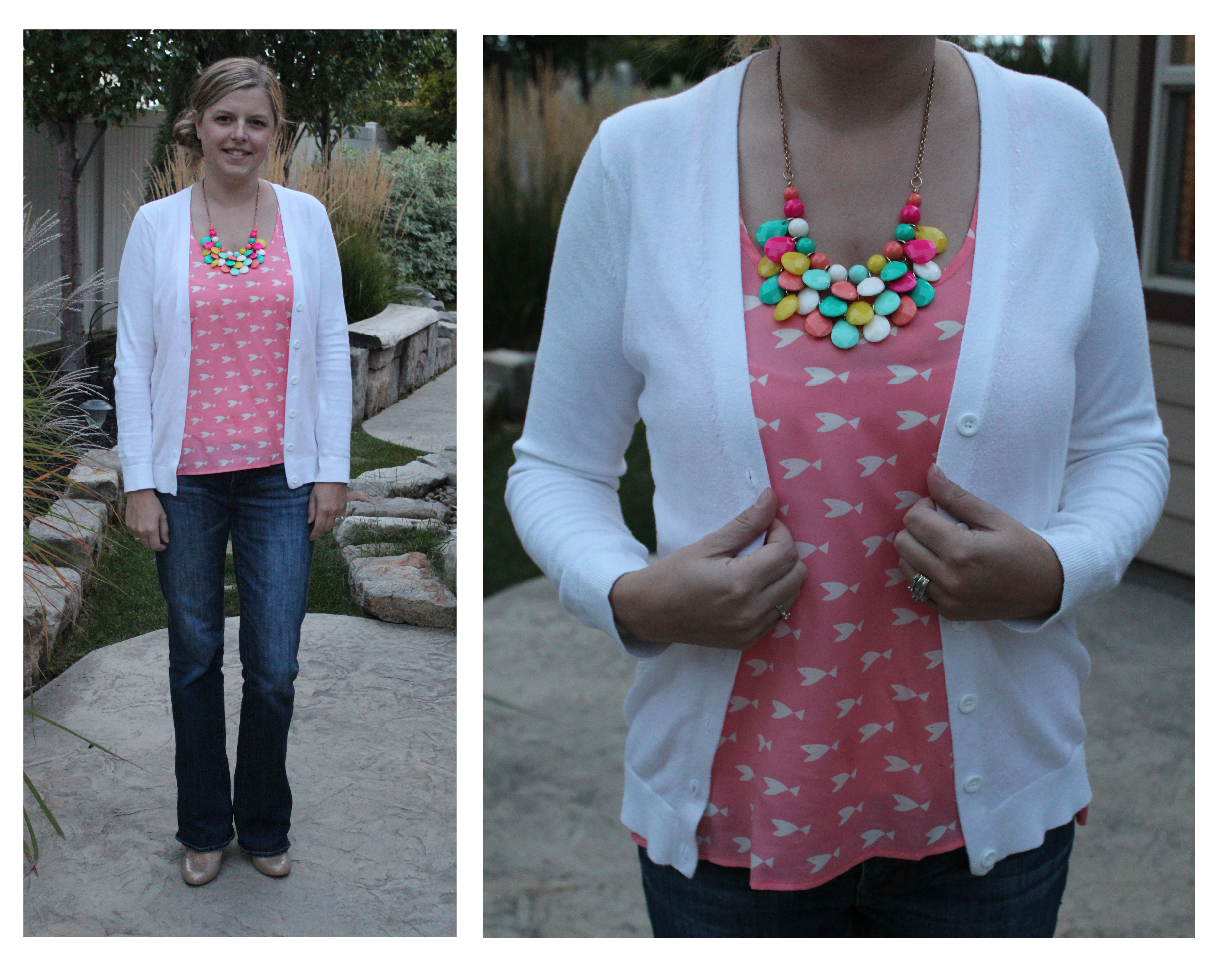 Black and white striped dress on clearance from Target. Lavender cardigan from The Loft Outlet paired with a turquoise belt and necklace.