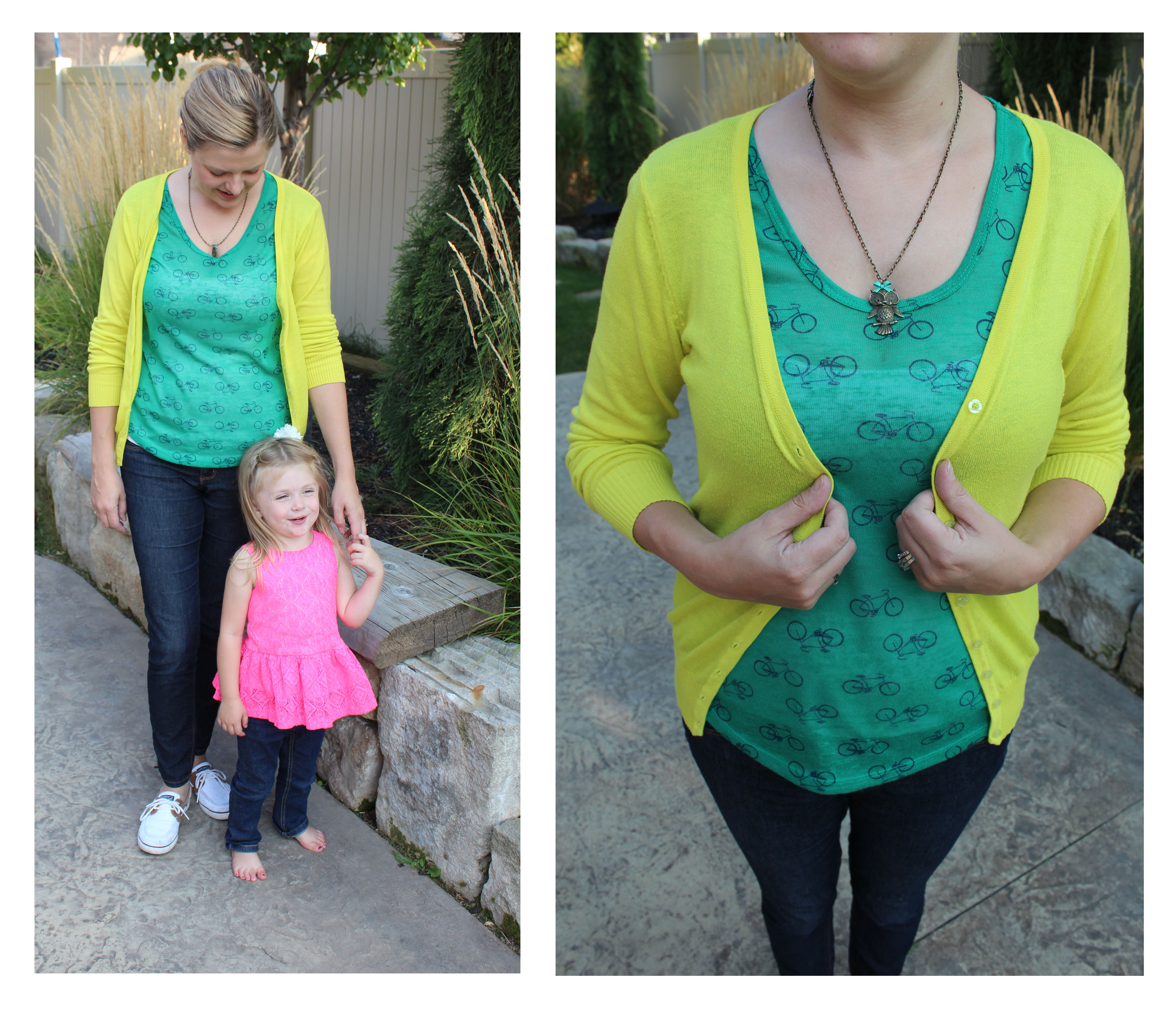 This is my oldest daughter posing with me for the outfit photo. She has just started to like taking photos with me, hope it keeps up. Green bike shirt from Fred Meyers (I know who knew you could find something cute there…sometimes you get lucky). Lime\neon yellow green cardigan from Bohme, a while ago so they might not have it anymore. They are the best place to get some seriously cute clothes. Skinny jeans are from Bohme too. Sperry lace detailed boat shoes finish it off from Journey’s for Kids… Yes I said kids. I can wear kids shoes but they actually have a lot of “kids” sizes that fit average women’s size shoes.